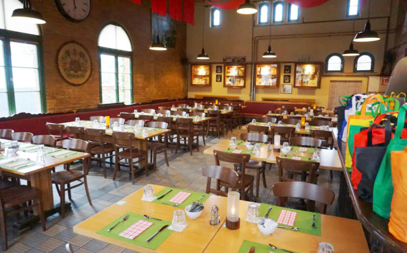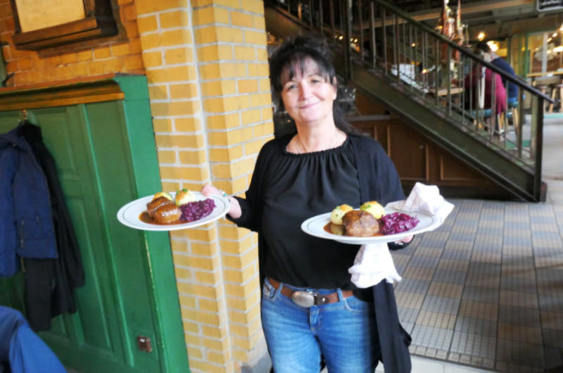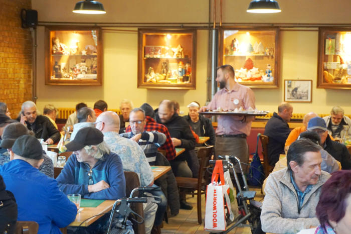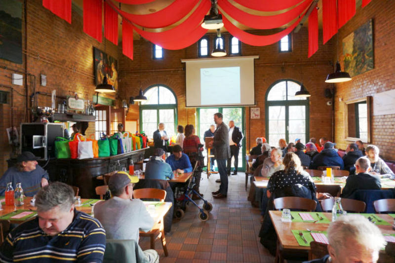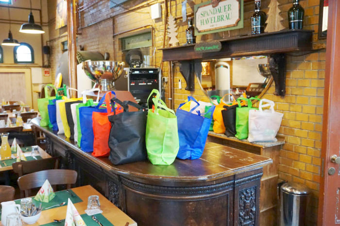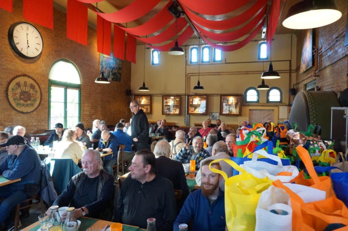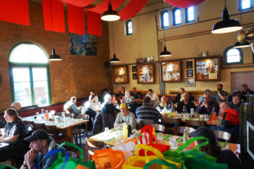 Das Team vom Brauhaus Spandau arbeitet an diesem Mittag ohne Lohn.Ein herzliches Dankeschön dafür!Links sehen Sie den Chef des Brau-hauses, der alle Gäste willkommen heißt.Beim Abschied gibt es Beutel mit Obst und kleinen nützlichen Dingen. Auch hier danken wir den Sponsoren!