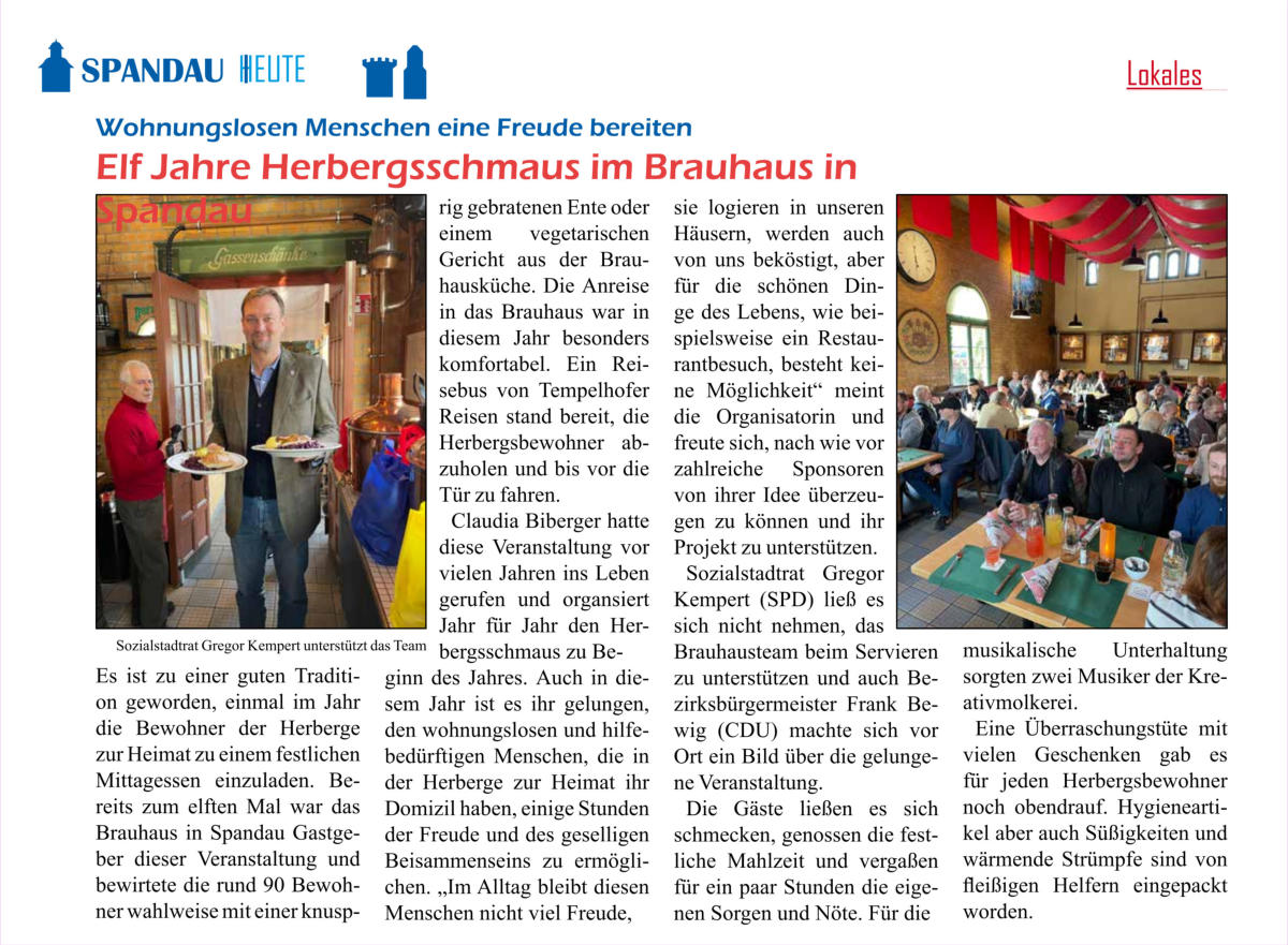 Berliner Woche „Herbergsschmaus feierte Jubiläum „ >>Spandau heute, Seite 17 „Zehn Jahre Herbergsschmaus“ >>Spandau TV. siehe unten